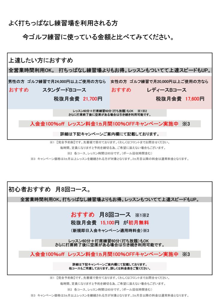 - 当日入会手続きの方のみ、全コース 初月レッスン料金が無料 !!※ジュニアコースは対象外となります。