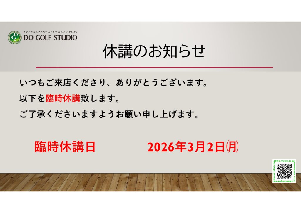 臨時休講の御案内 ホーム20262月 タグ: 休講日のお知らせ 2026年2月24日 0 投稿者 info@do-golf-studio.com 関連投稿 タグ: 休講日のお知らせ 年末年始の休講日のお知らせ 2025年12月15日 0 平素は格別のご高配を賜り厚く御礼申し上げます... すべて読む 投稿ナビゲーション 前の投稿次の投稿